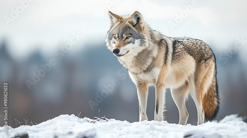 © Preecha, Naklejka premium A lone wolf silhouetted against a snow-covered mountain range, with a sense of solitude and strength in its posture. The scene evokes a feeling of awe and wonder at the resilience of wildlife in