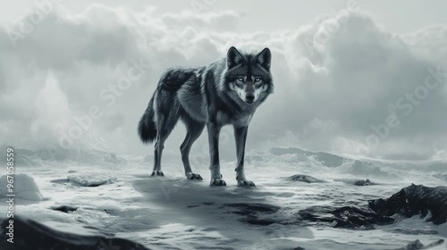 Naklejka premium A Lone Wolf Standing on a Snowy Landscape with Cloudy Skies