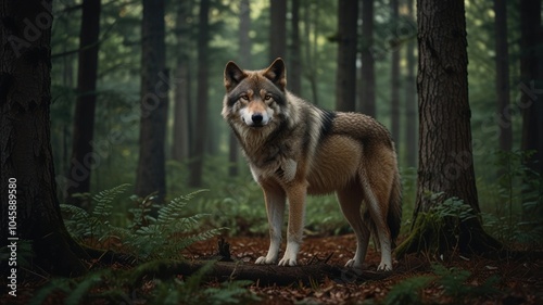 Fototapeta premium A lone wolf stands in a misty forest, its gaze fixed on the camera. The forest floor is covered in leaves and ferns, and the trees are tall and thick. The wolf's fur is