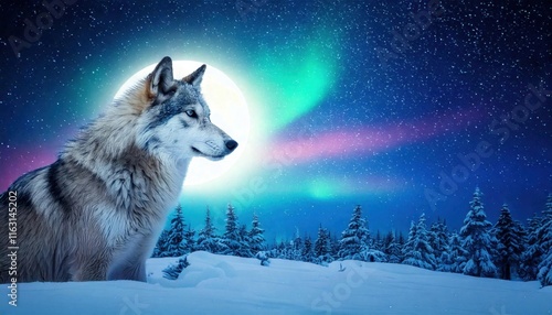 Naklejka premium A lone wolf stands in a snowy forest under a glowing full moon and vibrant northern lights on a starry night.