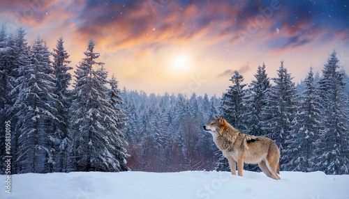 © art, Obraz premium A lone wolf stands in a snowy forest, watching the sun set over the horizon. The wolf's fur is thick and gray, and its eyes are piercing.