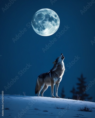 Naklejka premium A lone wolf stands on a snowy hill, howling at the full moon against a deep blue night sky, symbolizing wilderness, freedom, and the beauty of nature in winter