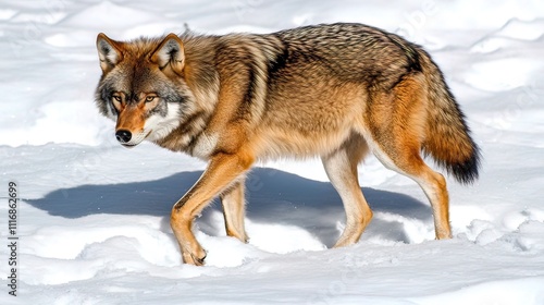 Fototapeta premium A lone wolf walks through a snowy landscape.
