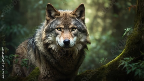 © mochalfin, Fototapeta premium A lone wolf with piercing yellow eyes stands in a forest, looking directly at the camera.