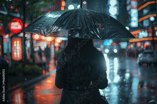 © Ghiska, Obraz premium A lone woman walks through a rainy city street at night, holding an umbrella above her head. The city lights reflect in the wet pavement.