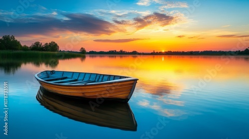© Azis Stock, Fototapeta premium A lone wooden boat floats on a calm lake at sunset, with the setting sun reflecting in the water.