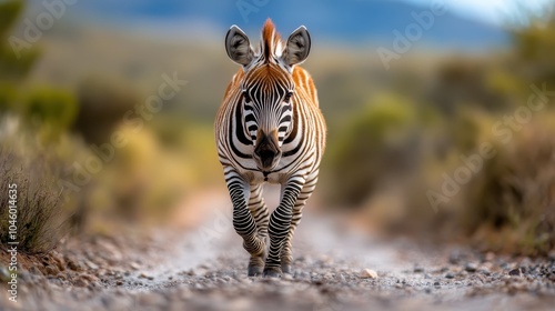 Fototapeta premium A lone zebra gracefully walks down a rocky path in the wilderness, showcasing...