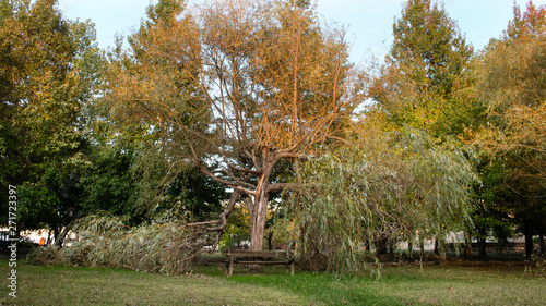 © Ana Fidalgo, Naklejka premium A lonely and crooked wooden bench in front of a split tree with a damaged branch dangling on the ground.