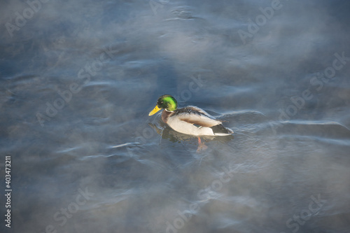 Obraz premium A lonely duck floats on a frozen river