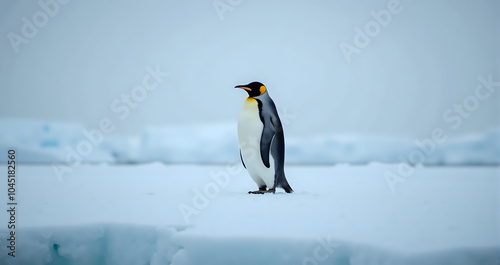 Fototapeta premium A lonely emperor penguin standing gracefully on a huge Antarctic ice field