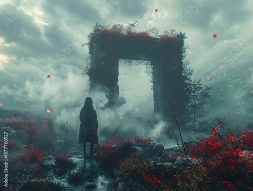 Fototapeta premium A Lonely Figure Stands Before a Mystical Stone Archway in a Foggy Forest