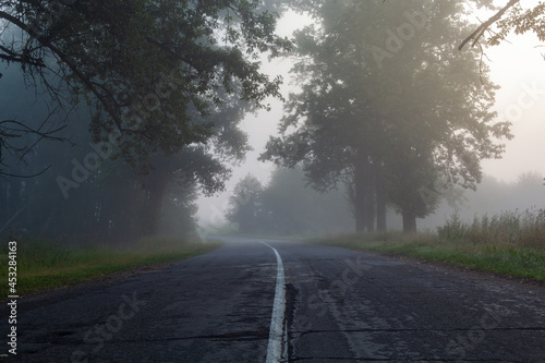 Fototapeta premium A lonely foggy road cutting through a thick and quiet wood.