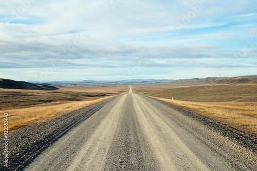 Fototapeta premium A lonely gravel road stretches out towards the distant horizon, winding its...
