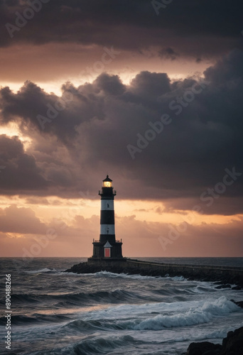 Fototapeta premium A lonely lighthouse silhouetted against a stormy sunset.