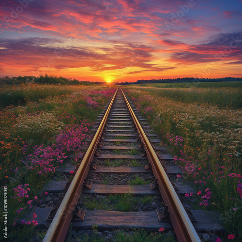© PARAMETH, Obraz premium A lonely railroad track stretching into the horizon under a vibrant sunset