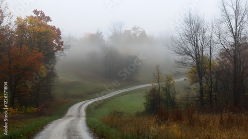 © Mr image, Obraz premium A lonely road cutting through a foggy, forested landscape