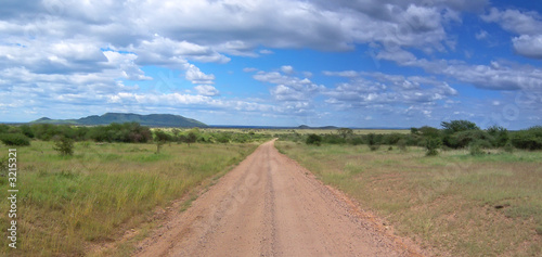 © Thomas Pozzo di Borgo, Fototapeta premium a lonely road track on the deep african savanna, serengeti park,