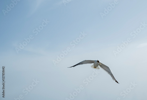 © mestock, Fototapeta premium A lonely seagull flies over the blue sky. Seagull hunting fish over the sea.