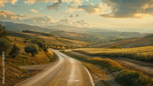 © Krit, Fototapeta premium a long a and winding road that disappears off into the distance of a beautiful vista