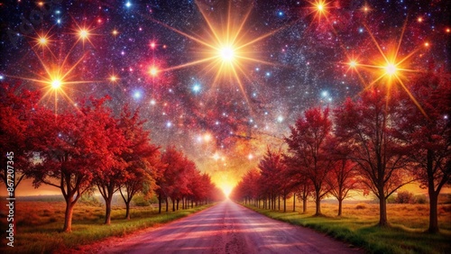 © Man888, Fototapeta premium A long and winding road surrounded by red trees leads to a bright light in the distance. The sky is dark and filled with stars.