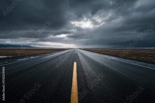 Naklejka premium A long asphalt road leading into a dark, moody sky after rain, capturing a...