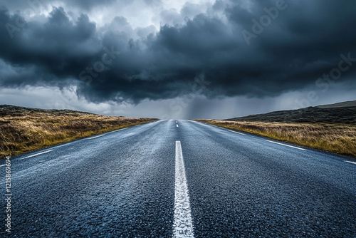 Naklejka premium A long asphalt road stretches towards a menacing storm on the horizon of a...