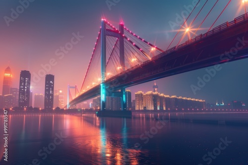 Obraz premium A long bridge stretches across a body of water at night, illuminated by...