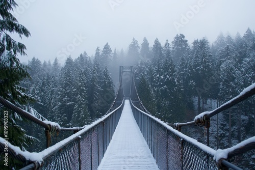 © Salander Studio, Fototapeta premium a long bridge with snow-covered railings surrounded by a winter landscape