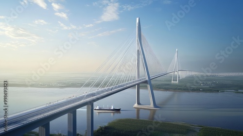 Obraz premium A long cable-stayed bridge, crossing a wide, deep river in a coastal region, with a ship passing beneath