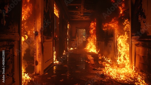 © wilaiwan, Obraz premium A long, dark hallway is engulfed in flames