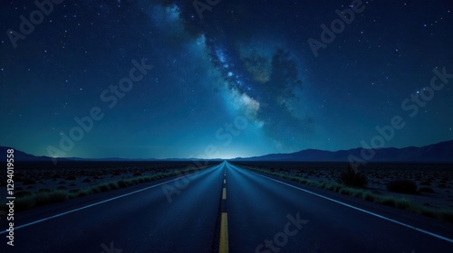 Fototapeta premium A long, dark highway stretches towards a brilliant, star-filled night sky, the Milky Way arching majestically above.