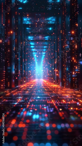 © imagineRbc, Obraz premium A long, dark tunnel with a blue light shining down on it. The tunnel is filled with bright, glowing lights that create a sense of movement and energy