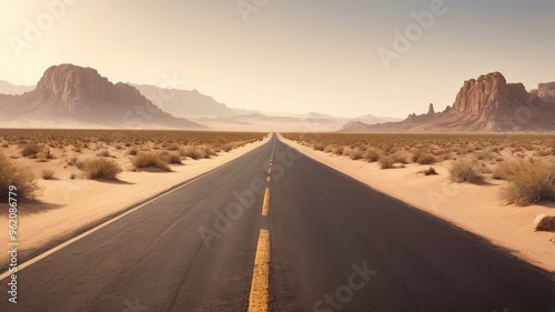 © Diclonius, Fototapeta premium A Long Deserted Road Stretches Through Vast Desert Landscapes Beneath a Bright Sky During the Afternoon