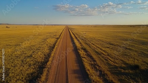 Naklejka premium A long dirt road stretches across a vast, golden field under a blue sky with...