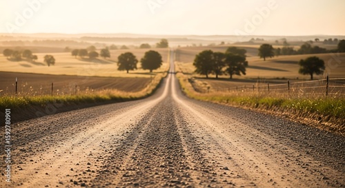 Naklejka premium A long, dusty, gravel road stretches towards the distant horizon, leading through fields.