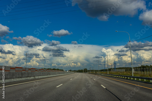 © Sergei, Fototapeta premium A long, empty highway with a few trees in the background