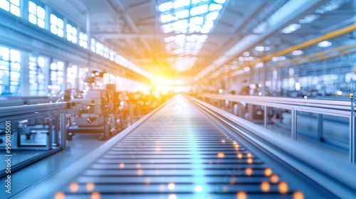 © Pornarun, Fototapeta premium A long, empty production line in a modern factory with sunlight streaming through the windows.