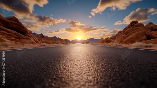 Naklejka premium A long empty road in the middle of a desert at sunset