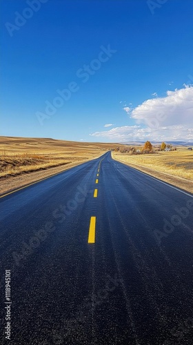 Naklejka premium A long, empty road stretches through a vast, open landscape under blue skies.