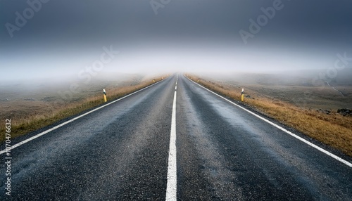 © Marko, Naklejka premium A long, empty road stretching into a foggy distance, symbolizing uncertainty, indecision, or a lack of direction