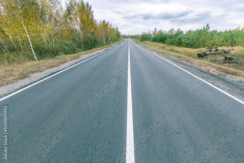 Fototapeta premium A long, empty road with a few trees in the background