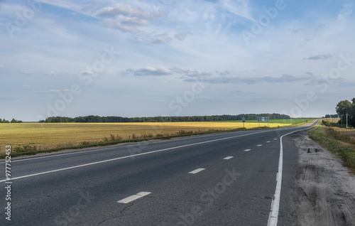 Fototapeta premium A long, empty road with a few trees in the background