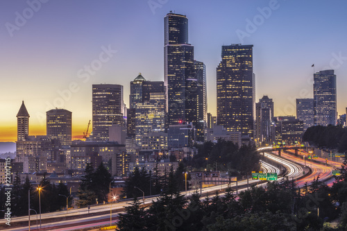 © Janisphoto, Naklejka premium A long exposure of the Seattle skyline with car light trails