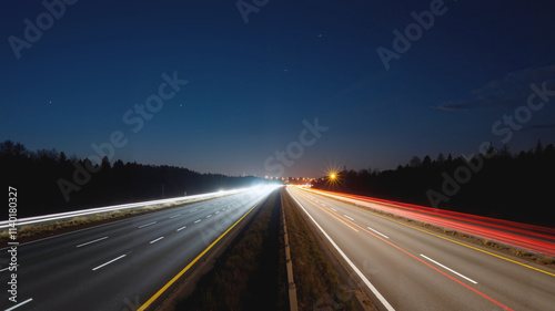 © LabioLoops, Fototapeta premium A long exposure shot of a highway at night, with light trails on the road, grass on the ground, trees in the background, and a sky with clouds.Wallpaper, banner.