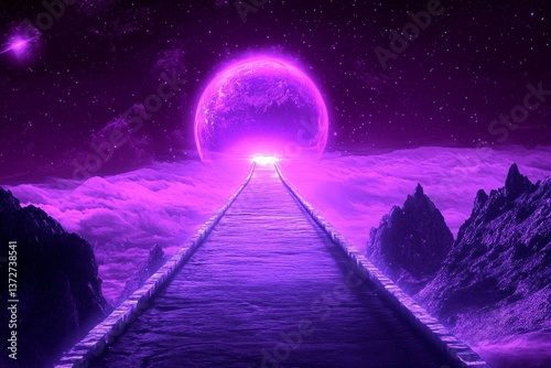 Fototapeta premium A long, glowing bridge connecting two planets, stretching across the vastness...