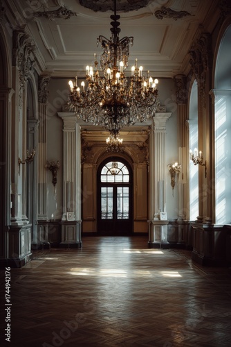 Fototapeta premium A long hallway with a chandelier beautifully hanging above