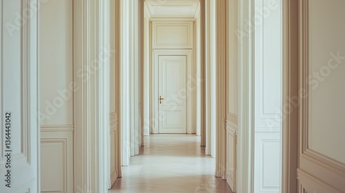 © Rangga, Fototapeta premium A long hallway with multiple white doors and molding details