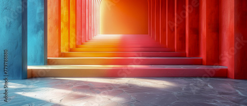 © IonelV, Fototapeta premium A long hallway with red, yellow, and blue pillars and empty wall