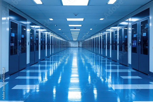 © NikahGeh, Fototapeta premium A long hallway with rows of closed doors and a shiny blue floor.