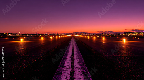 Obraz premium A long, illuminated airport runway stretches into the distance under a dramatic, vibrant purple and orange sunset sky, symbolizing travel, ambition, and new beginnings.